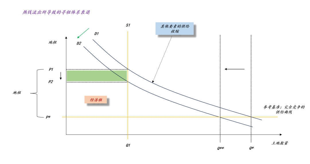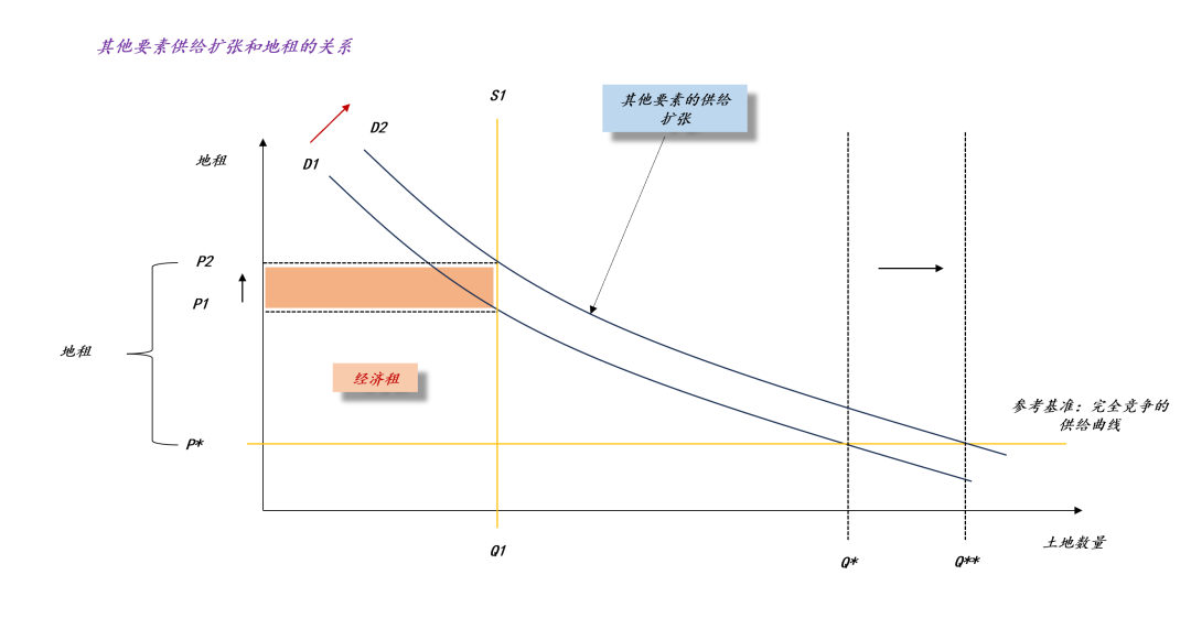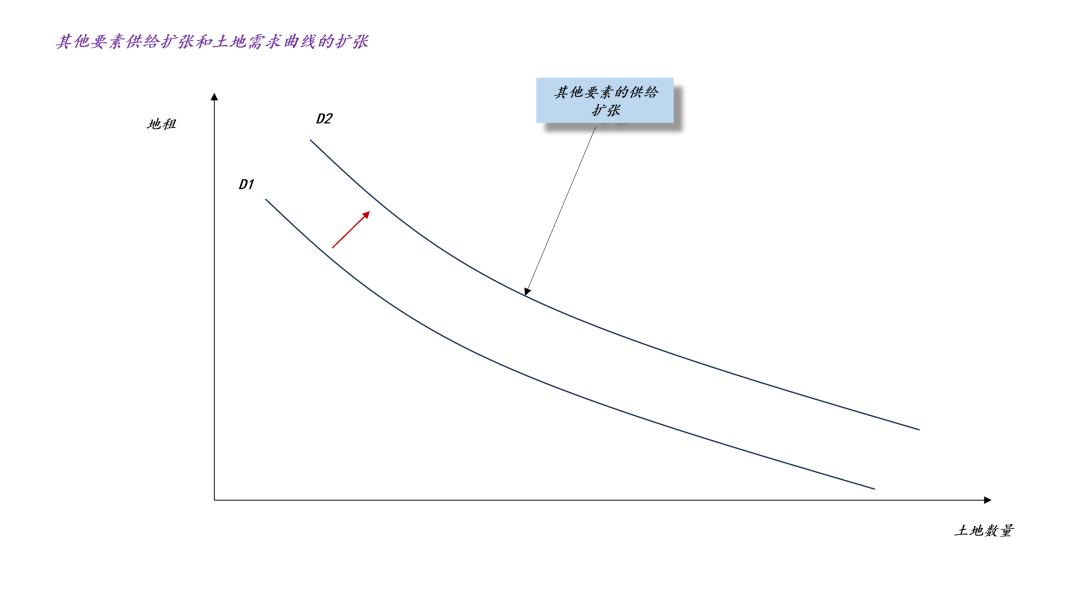 于是,我们就得到了上图,当其他要素的供给扩张时,土地的需求曲线扩张,从D1扩张到D2。显而易见,存款是一种极其重要的资源,海外存款的流入会扩张土地的需求曲线。