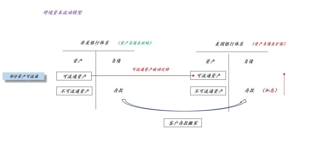 上图刻画了一个很简单的故事,当美联储保持高利率,非美银行体系的平均利率不变,那么,全球会发生存款搬家。于是,美国银行体系的资产负债表扩张,非美银行体系的资产负债表收缩。